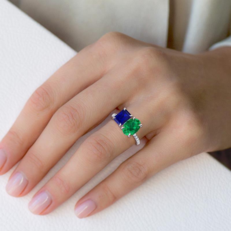 Undeniably dramatic, a 2 stone duo ring a unique treasure to symbolize your forever love. Coupled together Emerald Cut Blue Sapphire and an Oval Emerald accentuated with 16 shimmering diamonds a perfect representation of two lives joining together as one.