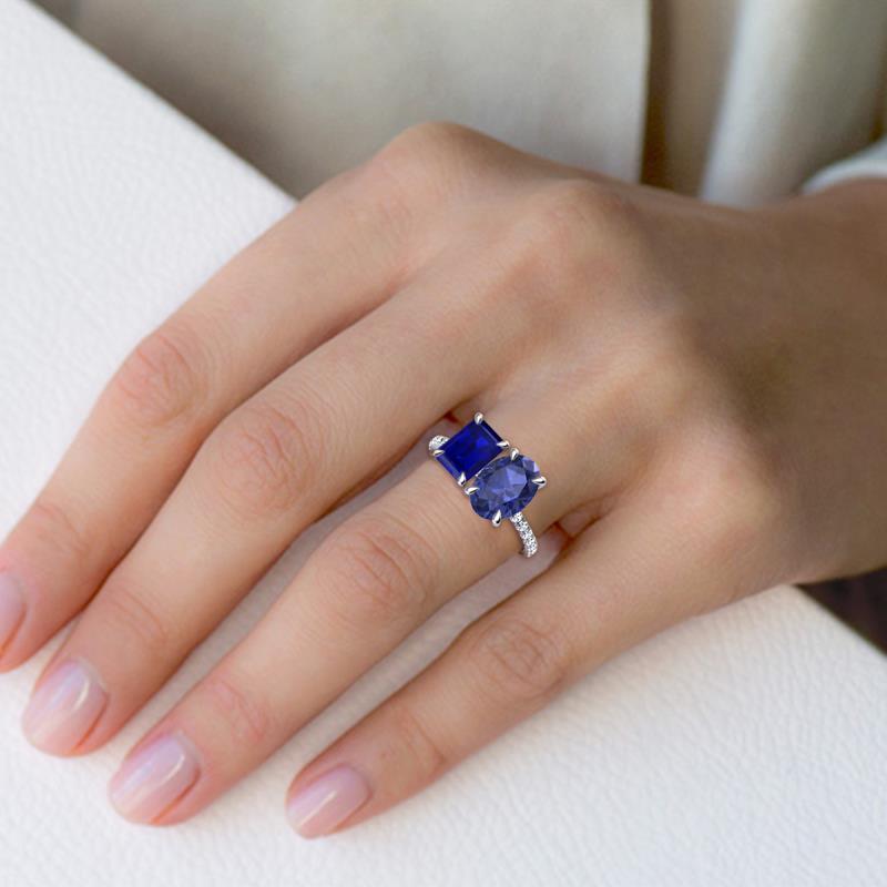 Undeniably dramatic, a 2 stone duo ring a unique treasure to symbolize your forever love. Coupled together Emerald Cut Blue Sapphire and an Oval Iolite accentuated with 16 shimmering diamonds a perfect representation of two lives joining together as one.