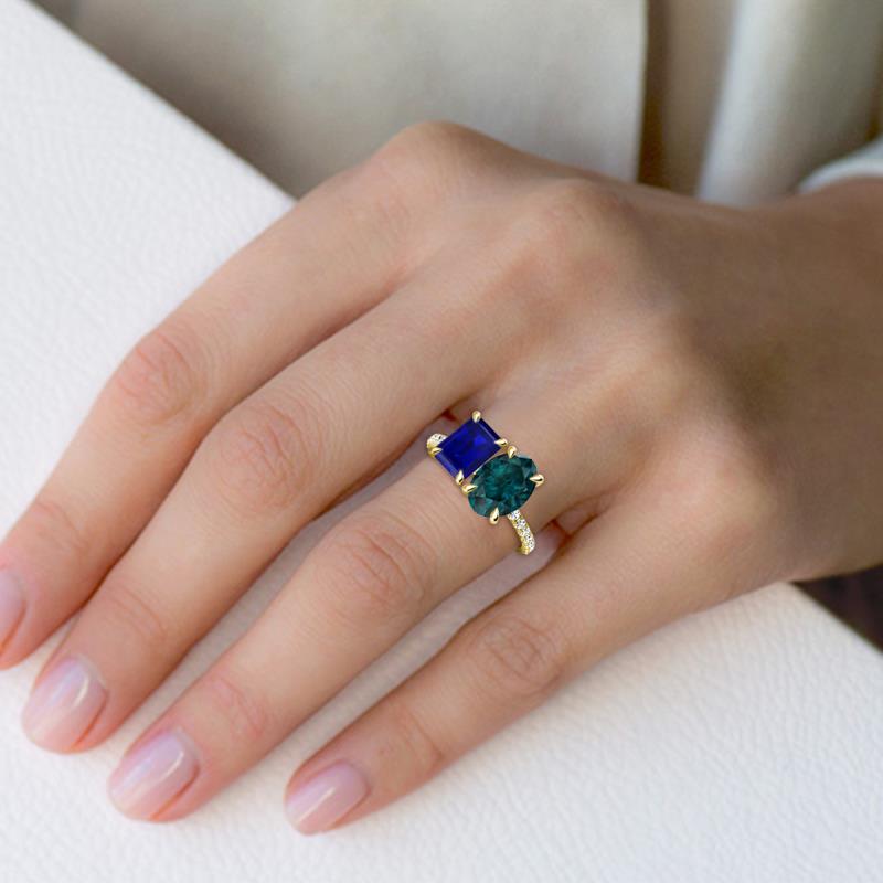 Undeniably dramatic, a 2 stone duo ring a unique treasure to symbolize your forever love. Coupled together Emerald Cut Blue Sapphire and an Oval London Blue Topaz accentuated with 16 shimmering diamonds a perfect representation of two lives joining together as one.