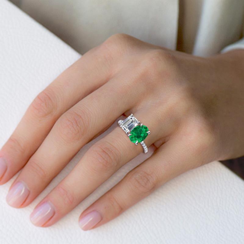 Undeniably dramatic, a 2 stone duo ring a unique treasure to symbolize your forever love. Coupled together Emerald Cut Forever Brilliant Moissanite and an Oval Emerald accentuated with 16 shimmering diamonds a perfect representation of two lives joining together as one.