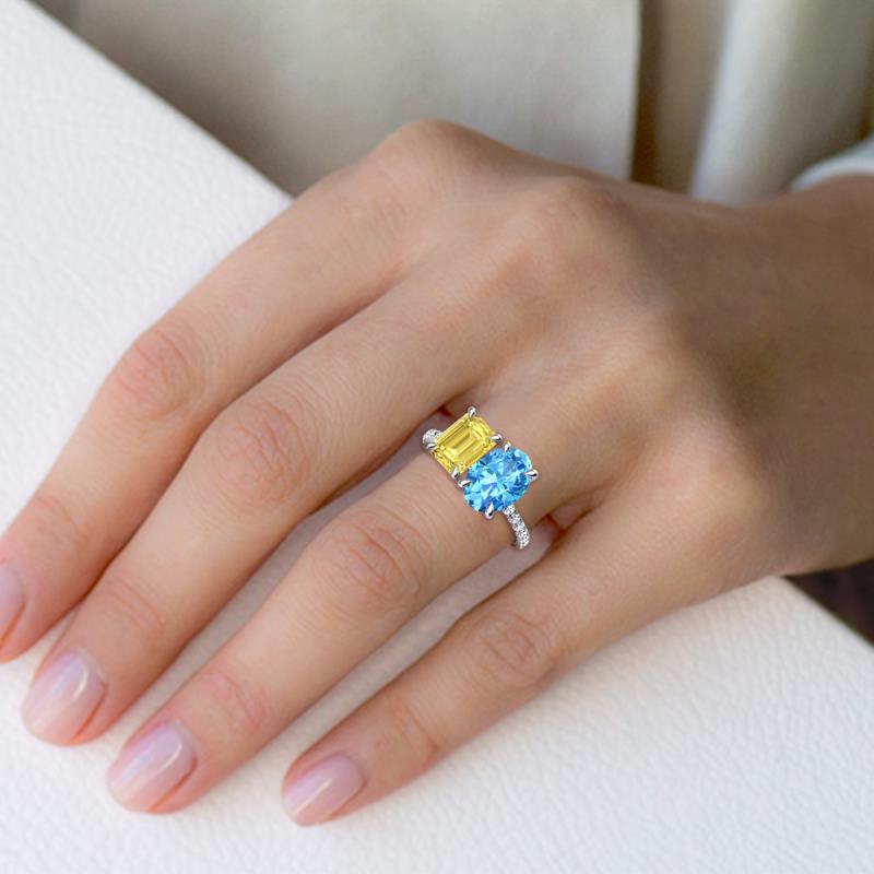 Undeniably dramatic, a 2 stone duo ring a unique treasure to symbolize your forever love. Coupled together Emerald Cut Yellow Sapphire and an Oval Blue Topaz accentuated with 16 shimmering diamonds a perfect representation of two lives joining together as one.