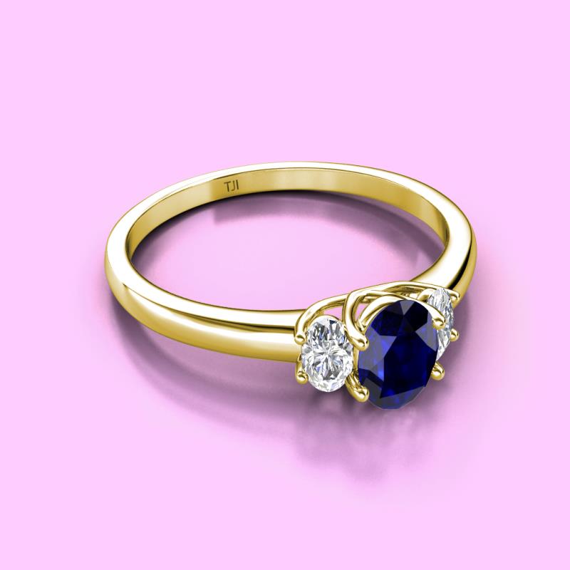 Get an Engagaement Ring that she has always been wishing for with Oval Blue Sapphire and Lab Grown Diamond combining together to form 3 Stones symbolising your past, present and future together and is surely to treasured.