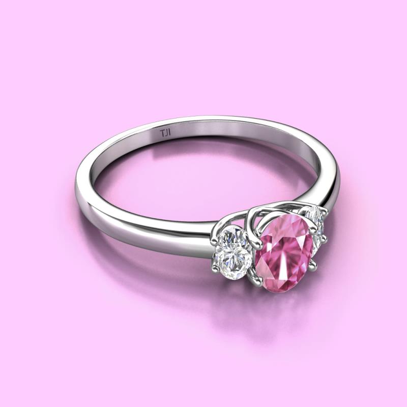 Oval Cut (7x5 mm) Pink Sapphire and Lab Grown Diamond 1.50 ctw Trellis Three Stone Engagement Ring 14K White Gold More Details ...