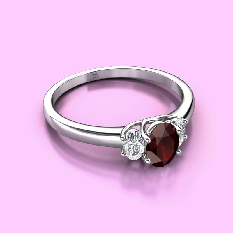 Get an Engagaement Ring that she has always been wishing for with Oval Red Garnet and Lab Grown Diamond combining together to form 3 Stones symbolising your past, present and future together and is surely to treasured.
