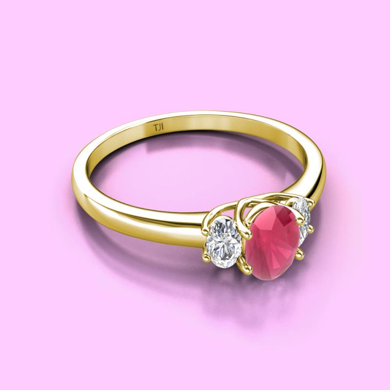 Oval Cut (7x5 mm) Rhodolite Garnet and Lab Grown Diamond 1.50 ctw Trellis Three Stone Engagement Ring 10K Yellow Gold More Details ...