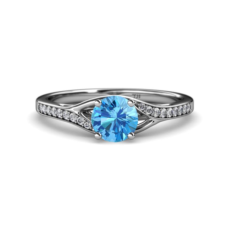 This Facinating Engagement Ring has 4 Prong Set Round Center Blue Topaz with crossover undergallery and single row graduated Pave Set Diamonds bypass shank making it a wonderful addition to your Jewelry Collection.