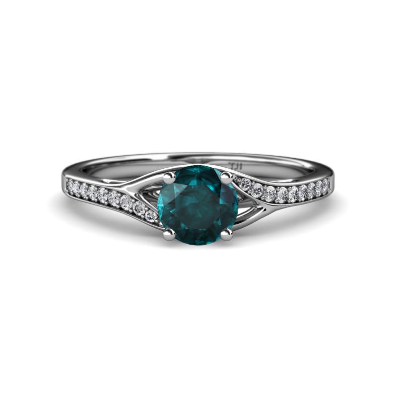 This Facinating Engagement Ring has 4 Prong Set Round Center London Blue Topaz with crossover undergallery and single row graduated Pave Set Diamonds bypass shank making it a wonderful addition to your Jewelry Collection.