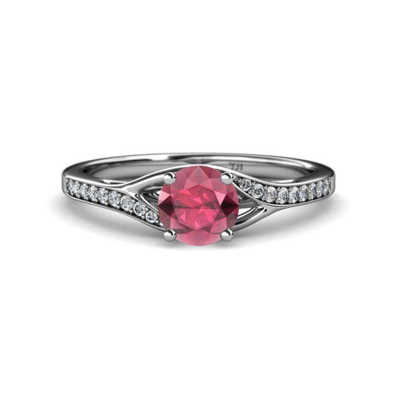 This Facinating Engagement Ring has 4 Prong Set Round Center Rhodolite Garnet with crossover undergallery and single row graduated Pave Set Diamonds bypass shank making it a wonderful addition to your Jewelry Collection.