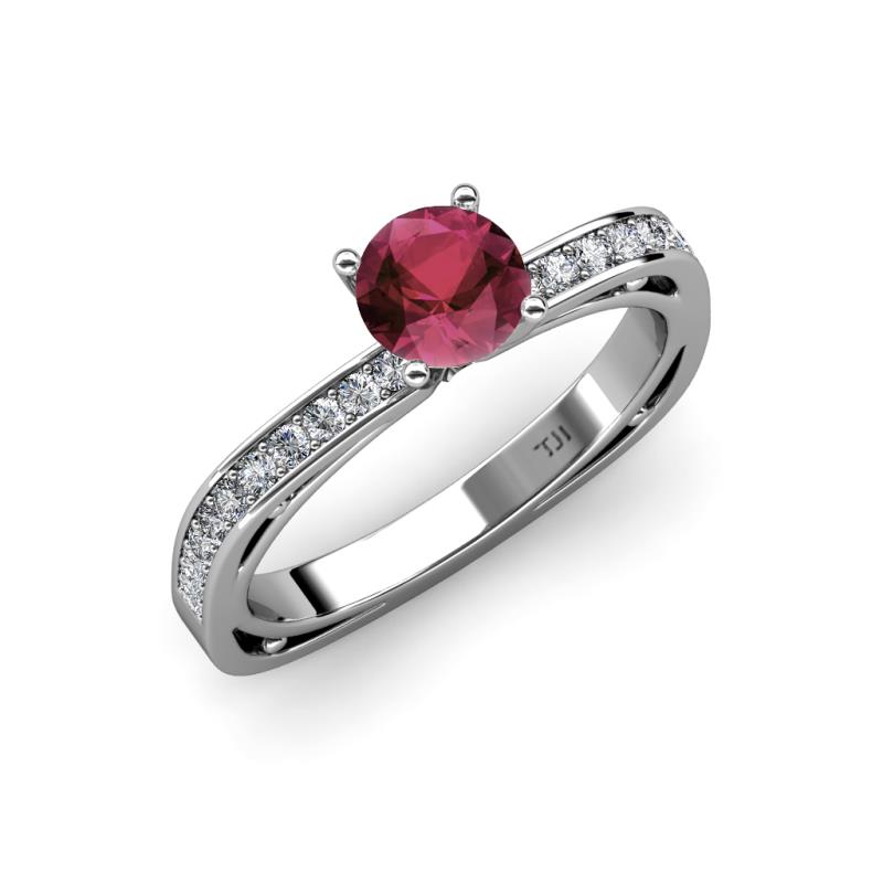 Classic and elegant, this 1.10 cttw Engagement Ring offers a unique twist on tradition which Centers Rhodolite Garnet and small round diamonds flank the Euro Shank design adorning the graceful shank making it an ideal choice for a loving proposal.