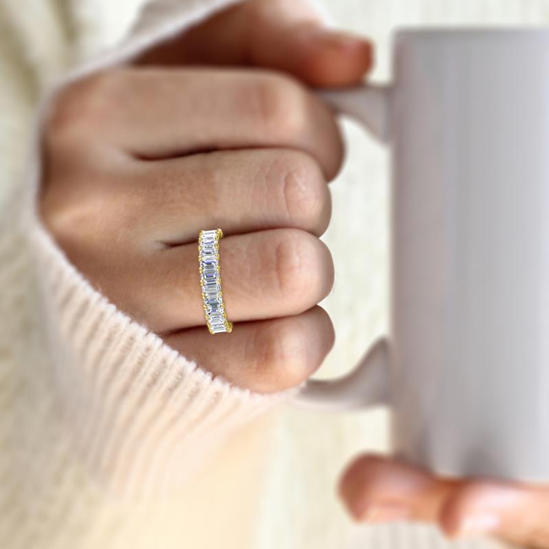 Crafted with timeless elegance, this Eternity Band showcases an emerald-shaped Lab Grown Diamonds set in Prong setting, radiating sophistication. Set in 10K Yellow Gold , it captivates admirers with its enduring allure, promising both durability and lasting beauty.