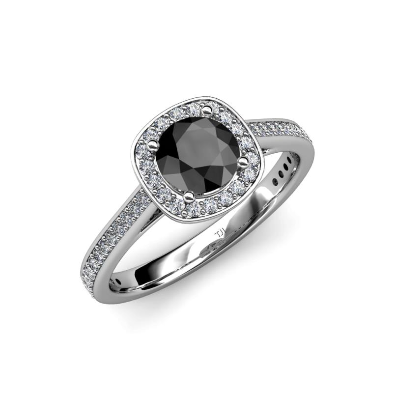 A Halo Cushion Frame of shimmering Round White Diamonds surrounds the Center Black Diamond while additional White Diamonds line the Ring's shank which gives a grace to the Ring making it a brilliant circle of Love.