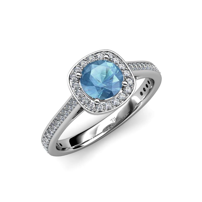 A Halo Cushion Frame of shimmering Round Diamonds surrounds the Center Blue Topaz while additional Diamonds line the Ring's shank which gives a grace to the Ring making it a brilliant circle of Love.