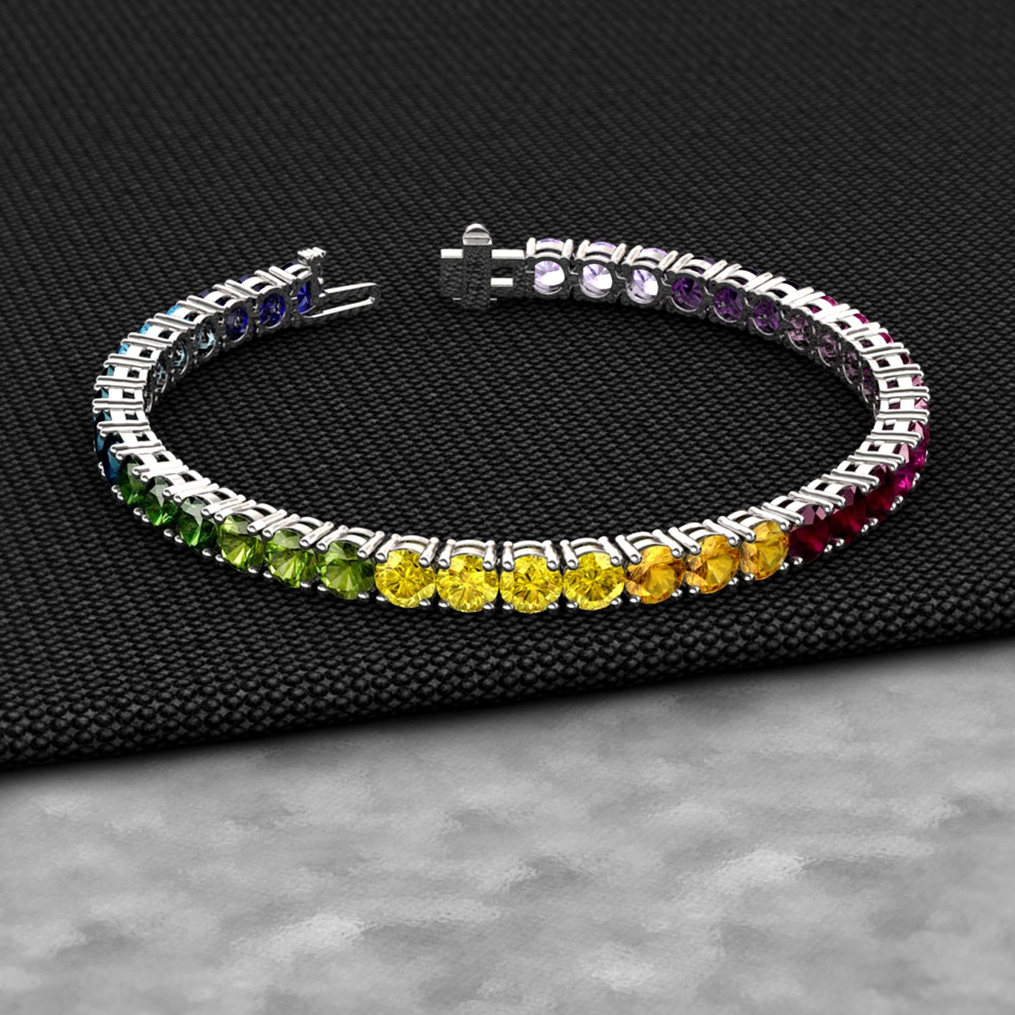 This vibrant tennis bracelet is inspired from the Hindu Festival of Colors - Holi! A time that is focused on bringing beauty and color into your life, this bracelet will illuminate your wrist with multiple gemstones colors. The bracelet uses a prong setting and is secured with safety clasp.