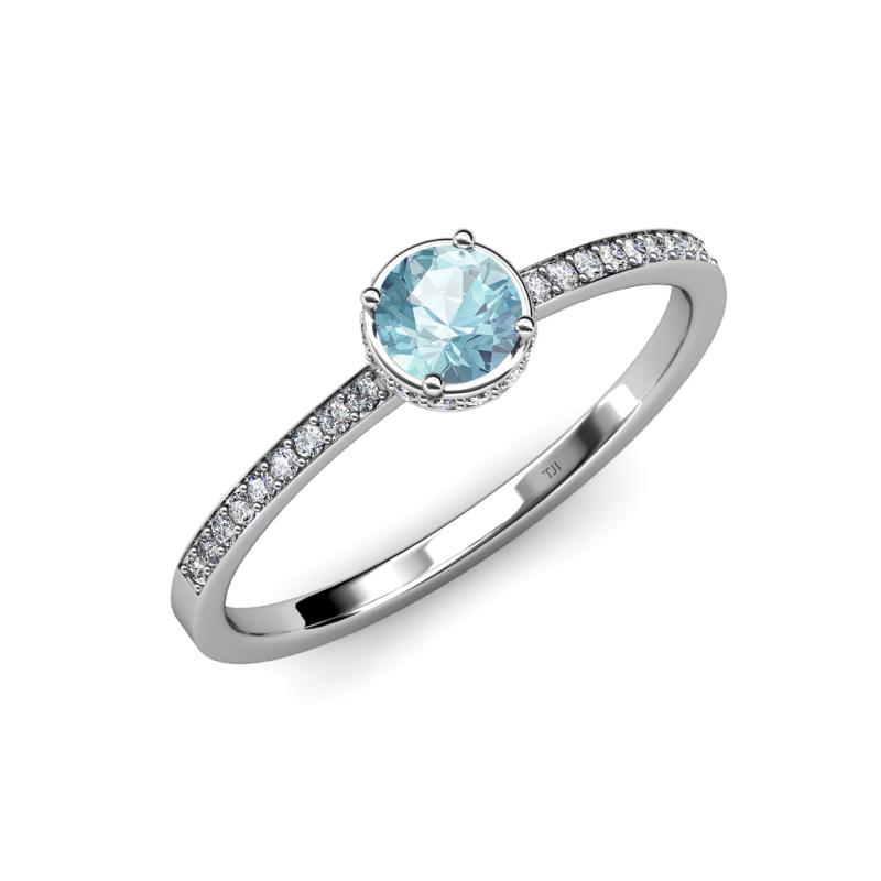 This Elegant 0.88 ct tw Halo Engagement Ring showcases a crown of Center Aquamarine which sits pretty along the string of Diamonds with additional Diamonds on the shank making it a generous gift of love.