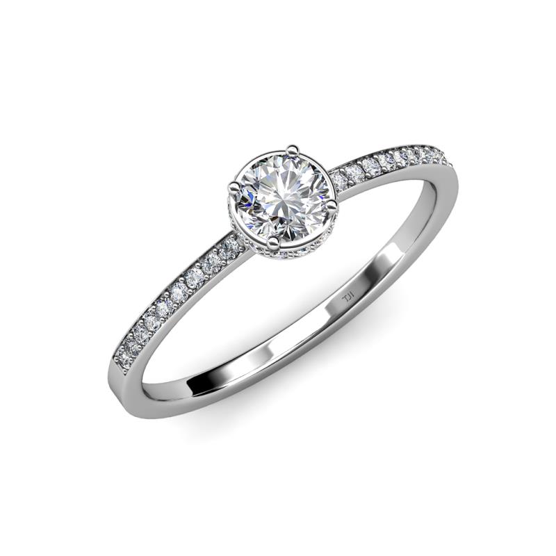 This Elegant 0.90 ct tw Halo Engagement Ring showcases a crown of Center Diamond which sits pretty along the string of Diamonds with additional Diamonds on the shank making it a generous gift of love.