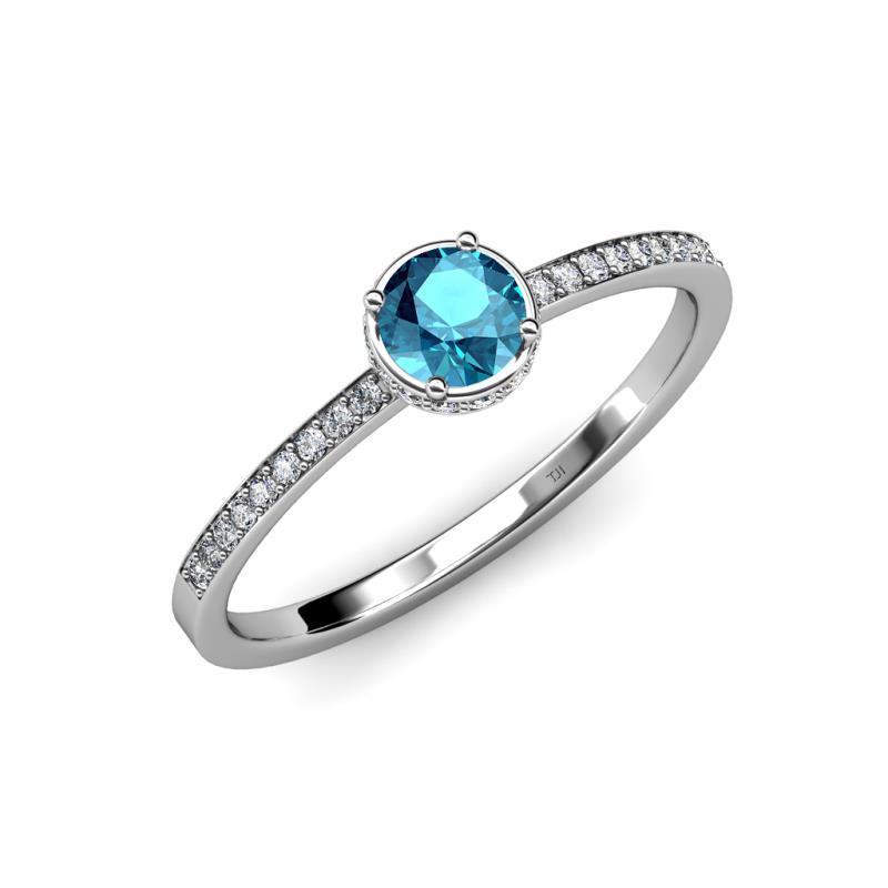 This Elegant 0.95 ct tw Halo Engagement Ring showcases a crown of Center London Blue Topaz which sits pretty along the string of Diamonds with additional Diamonds on the shank making it a generous gift of love.