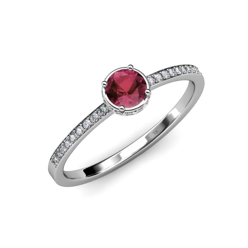 This Elegant 0.90 ct tw Halo Engagement Ring showcases a crown of Center Rhodolite Garnet which sits pretty along the string of Diamonds with additional Diamonds on the shank making it a generous gift of love.
