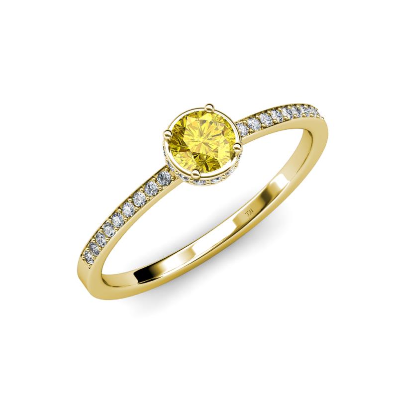This Elegant 0.90 ct tw Halo Engagement Ring showcases a crown of Center Yellow Sapphire which sits pretty along the string of Diamonds with additional Diamonds on the shank making it a generous gift of love.