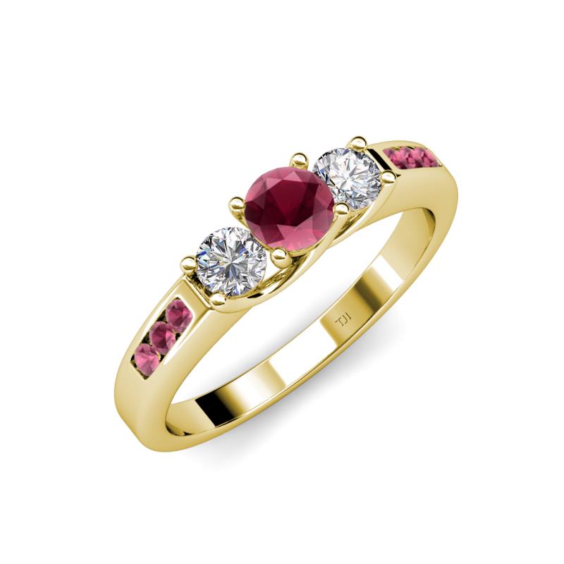Rhodolite Garnet and Diamond Womens Three Stone Engagement Ring with Rhodolite Garnet on Side Bar 0.85 ctw 14K Yellow Gold More Details ...
