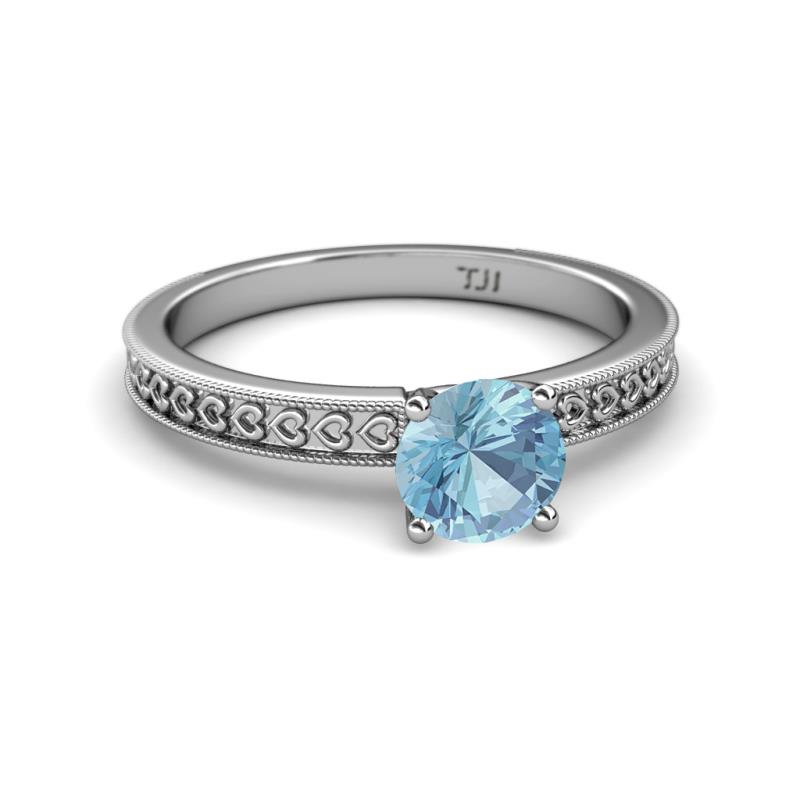 A perfect Ring to show your love and devotion, this Vintage inspired Aquamarine Solitaire Engagement Ring features motif of Engraved hearts all around the shank while a classy finishing touch is perfectly provided by milgrain edges.