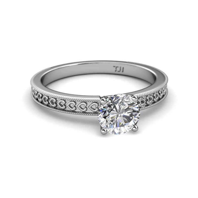 A perfect Ring to show your love and devotion, this Vintage inspired Diamond Solitaire Engagement Ring features motif of Engraved hearts all around the shank while a classy finishing touch is perfectly provided by milgrain edges.