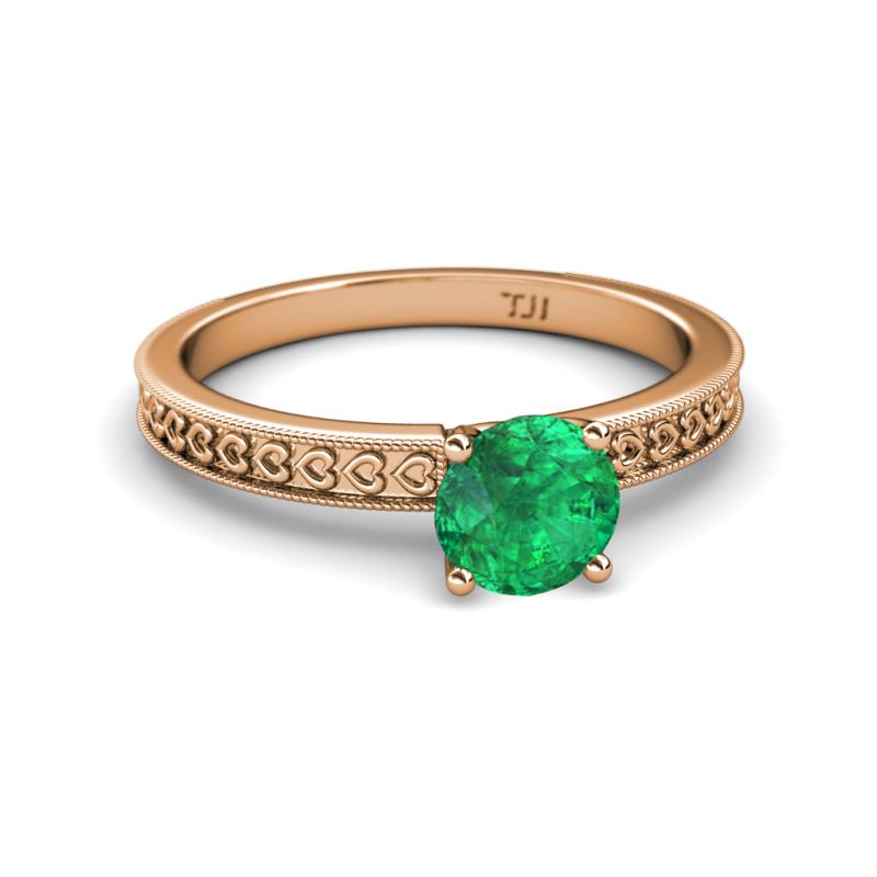 A perfect Ring to show your love and devotion, this Vintage inspired Emerald Solitaire Engagement Ring features motif of Engraved hearts all around the shank while a classy finishing touch is perfectly provided by milgrain edges.