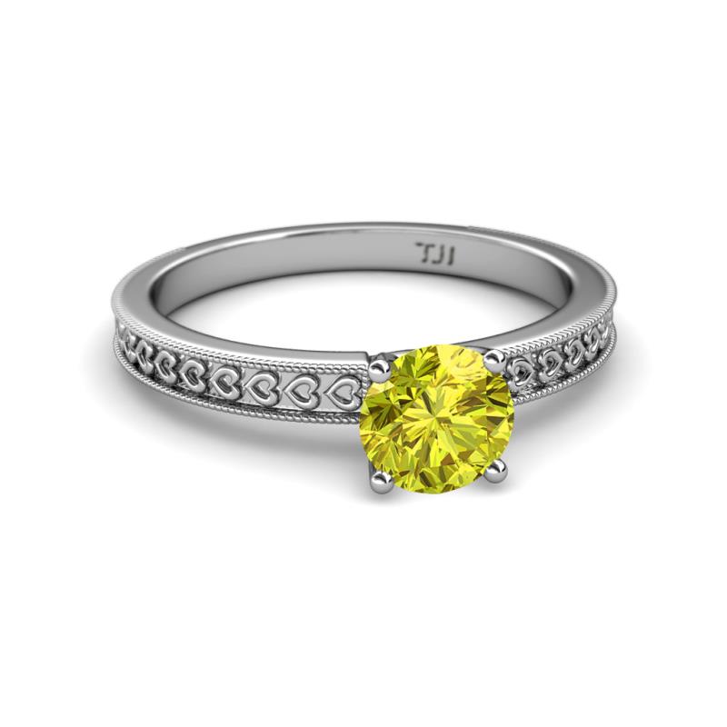 A perfect Ring to show your love and devotion, this Vintage inspired Yellow Diamond Solitaire Engagement Ring features motif of Engraved hearts all around the shank while a classy finishing touch is perfectly provided by milgrain edges.
