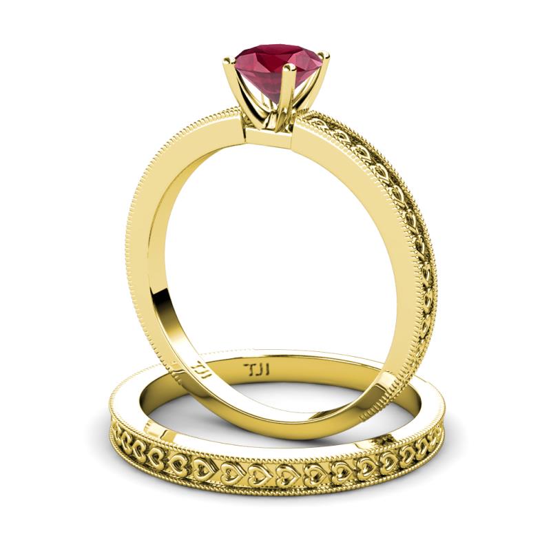 1.00 ct Classic Rhodolite Garnet (6.50 mm) Heart Engraved Solitaire Women Engagement Ring & Wedding Band Set in 14K Yellow Gold . More Details ...