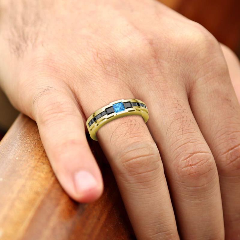 1.40 ctw Princess shape Blue Topaz (4 mm) accented Black Diamonds Men Wedding Band using Channel setting in 10K Yellow Gold More Details ...