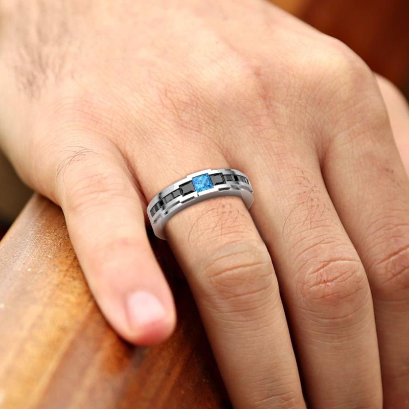 1.40 ctw Princess shape Blue Topaz (4 mm) accented Black Diamonds Men Wedding Band using Channel setting in 14K White Gold More Details ...