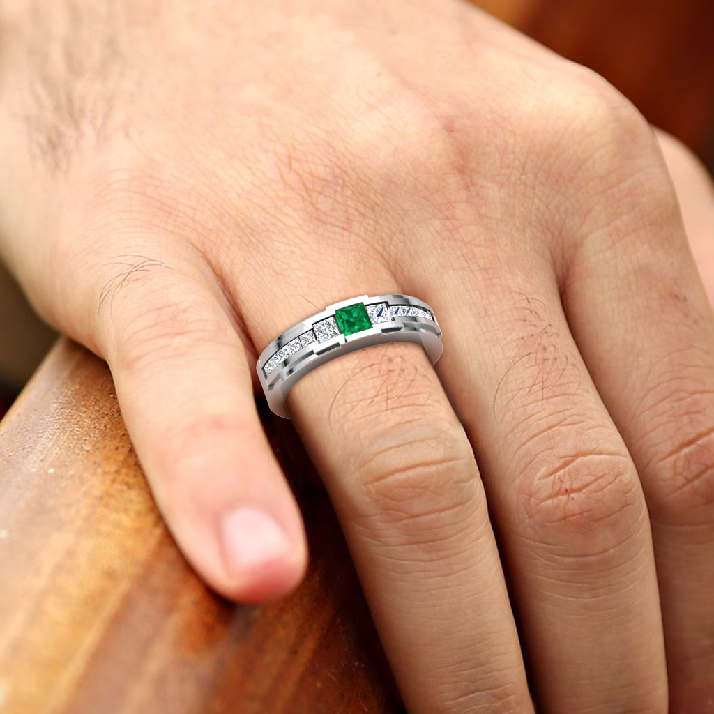 1.21 ctw Princess shape Emerald accented Lab Grown Diamonds Men Wedding Band using Channel setting in Platinum More Details ...