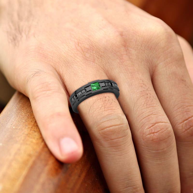 1.37 ctw Princess shape Green Garnet (4 mm) accented Black Diamonds Men Wedding Band using Channel setting in 18K Gold More Details ...