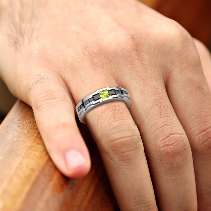 1.40 ctw Princess shape Peridot (4 mm) accented Black Diamonds Men Wedding Band using Channel setting in Platinum More Details ...