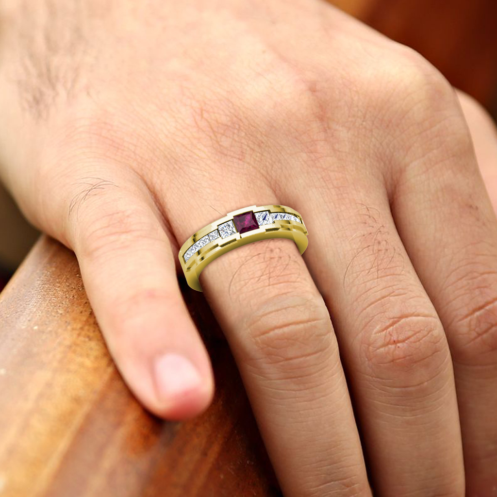 1.24 ctw Princess shape Rhodolite Garnet accented Lab Grown Diamonds Men Wedding Band using Channel setting in 18K Yellow Gold More Details ...