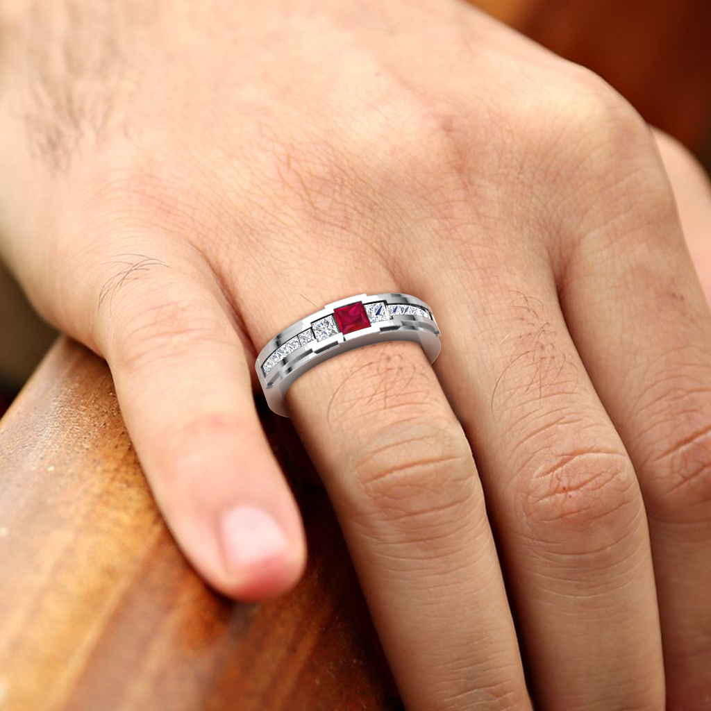 1.21 ctw Princess shape Ruby accented Lab Grown Diamonds Men Wedding Band using Channel setting in Platinum More Details ...