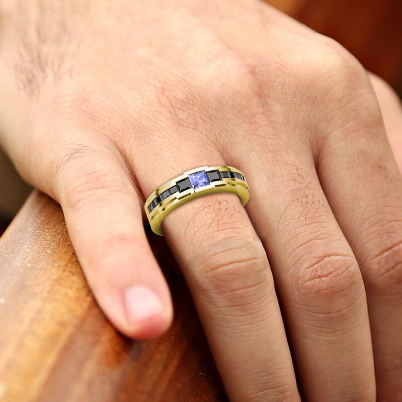 1.40 ctw Princess shape Tanzanite (4 mm) accented Black Diamonds Men Wedding Band using Channel setting in 14K Yellow Gold More Details ...