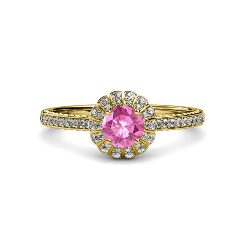 1 ctw Round Lab Created Pink Sapphire and Diamond Floral Halo Engagement Ring 18K Yellow Gold More Details ...