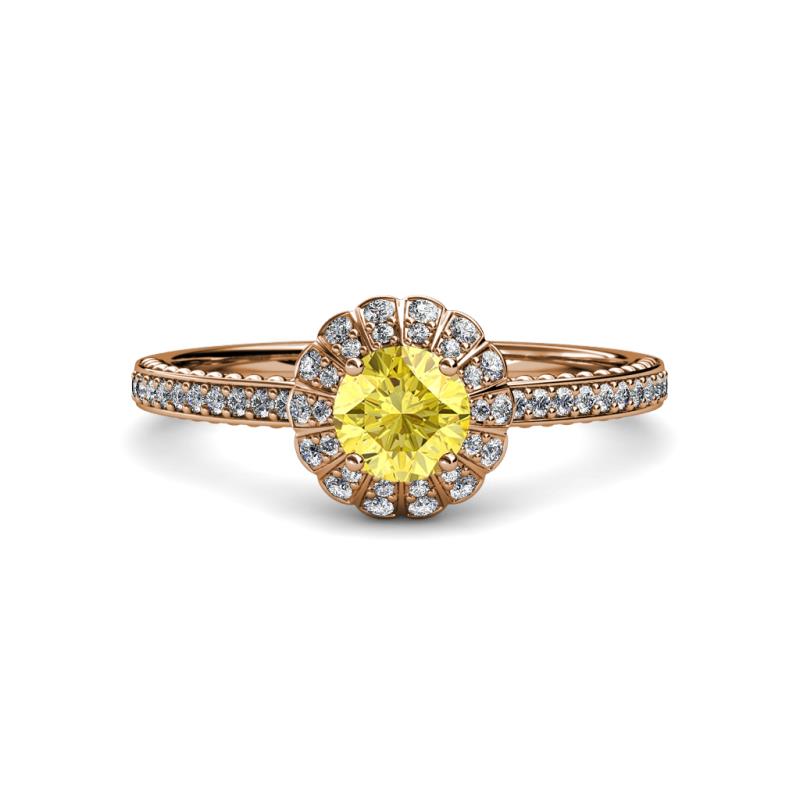 This Halo Engagement Ring is perfect to Celebrate one of the most unforgettable Moments of your Life with Center Lab Created Yellow Sapphire in 4 Prong Setting embraced by Dazzling Side Diamonds in a Floral Halo Design with beaded single row Pave Shank has a perfect balance of class and style.