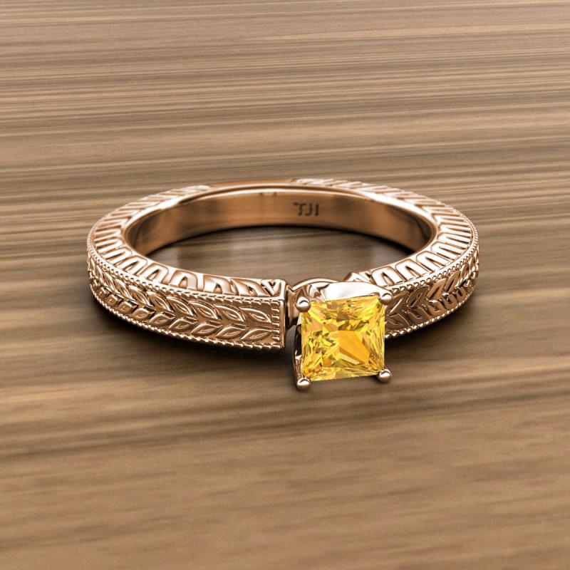 This vintage style 1.00 ct Solitaire Ring is sure to please any bride-to-be with a gleaming Princess cut Citrine which enhances the graceful leaf work engraved on the shank including a milgrain finish that adorn this entire Ring.