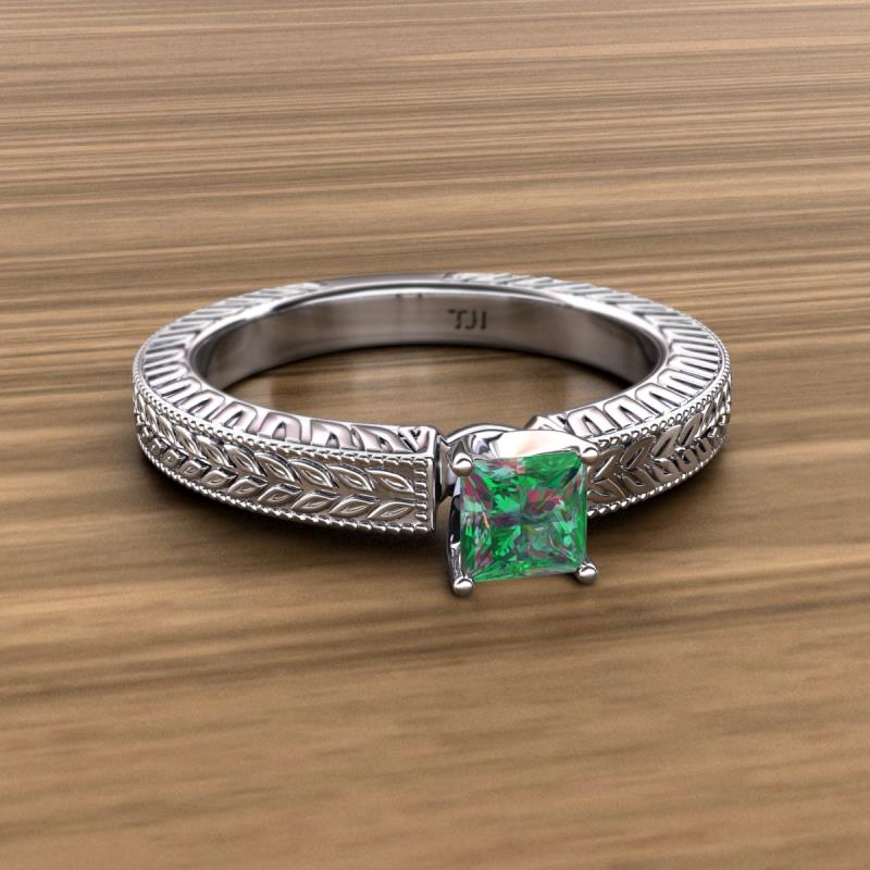 This vintage style 1.44 ct Solitaire Ring is sure to please any bride-to-be with a gleaming Princess cut Lab Created Alexandrite which enhances the graceful leaf work engraved on the shank including a milgrain finish that adorn this entire Ring.