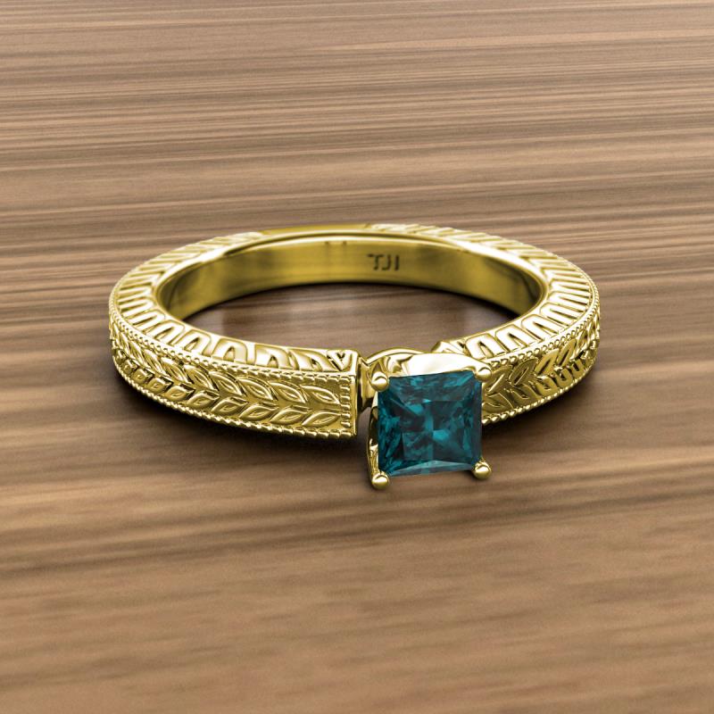 This vintage style 1.40 ct Solitaire Ring is sure to please any bride-to-be with a gleaming Princess cut London Blue Topaz which enhances the graceful leaf work engraved on the shank including a milgrain finish that adorn this entire Ring.
