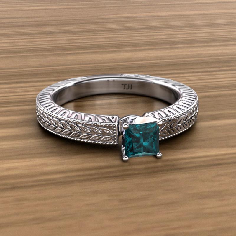 This vintage style 1.40 ct Solitaire Ring is sure to please any bride-to-be with a gleaming Princess cut London Blue Topaz which enhances the graceful leaf work engraved on the shank including a milgrain finish that adorn this entire Ring.