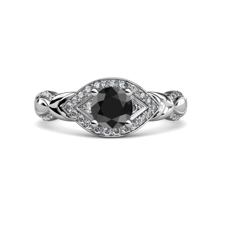 The very essence of vintage,ask her to be yours forever with this Engagement Ring holding a Center Black Diamond surrounded by Pave set White Diamonds in arch shape head along with single stone heart and swirl undergallery work with additional two row of pave set white Dimaonds in the split lavaliere shank giving it a Royal look.