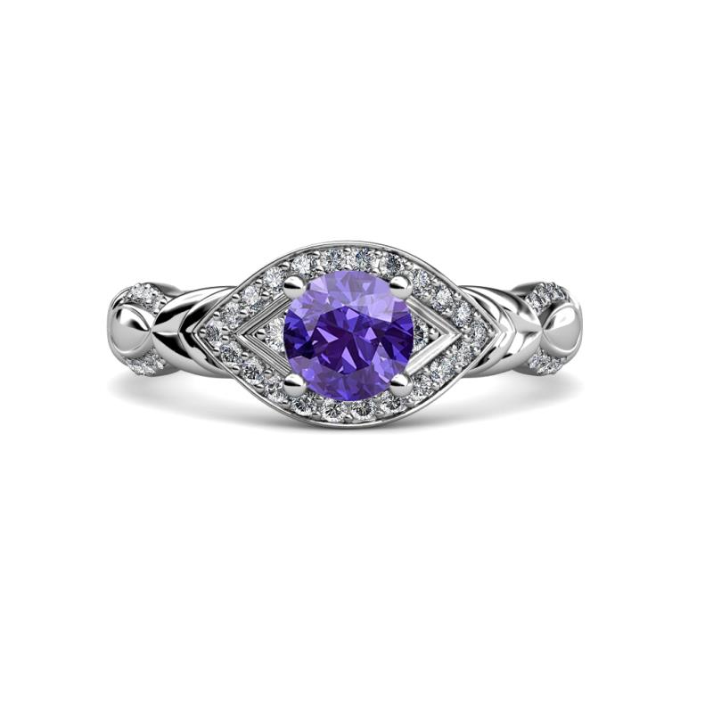 The very essence of vintage,ask her to be yours forever with this Engagement Ring holding a Center Iolite surrounded by Pave set Diamonds in arch shape head along with single stone heart and swirl undergallery work with additional two row of pave set Dimaonds in the split lavaliere shank giving it a Royal look.