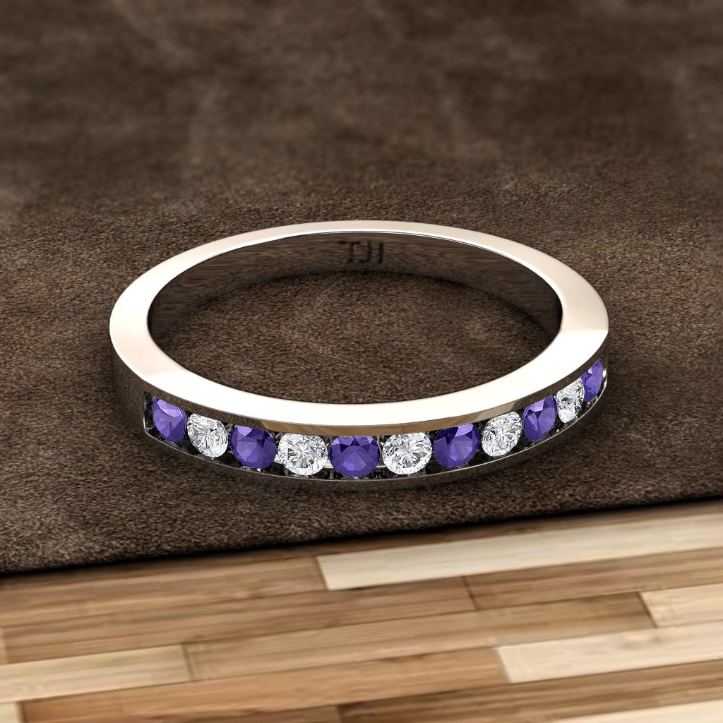 Shining with opulence and femine appeal,this 0.28 ctw Wedding Band inspires any attire with Glittering Round Channel Set Iolite and Lab Grown Diamond making your Wedding day more Enduring.