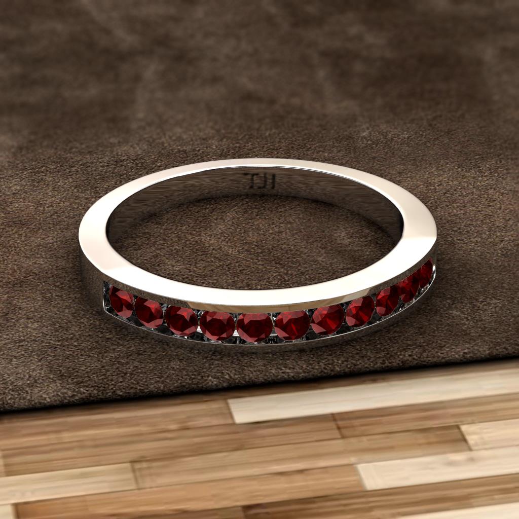 Shining with opulence and femine appeal,this 0.40 Carat tw Wedding Band inspires any attire with Glittering Round Channel Set Red Garnet making your Wedding day more Enduring.