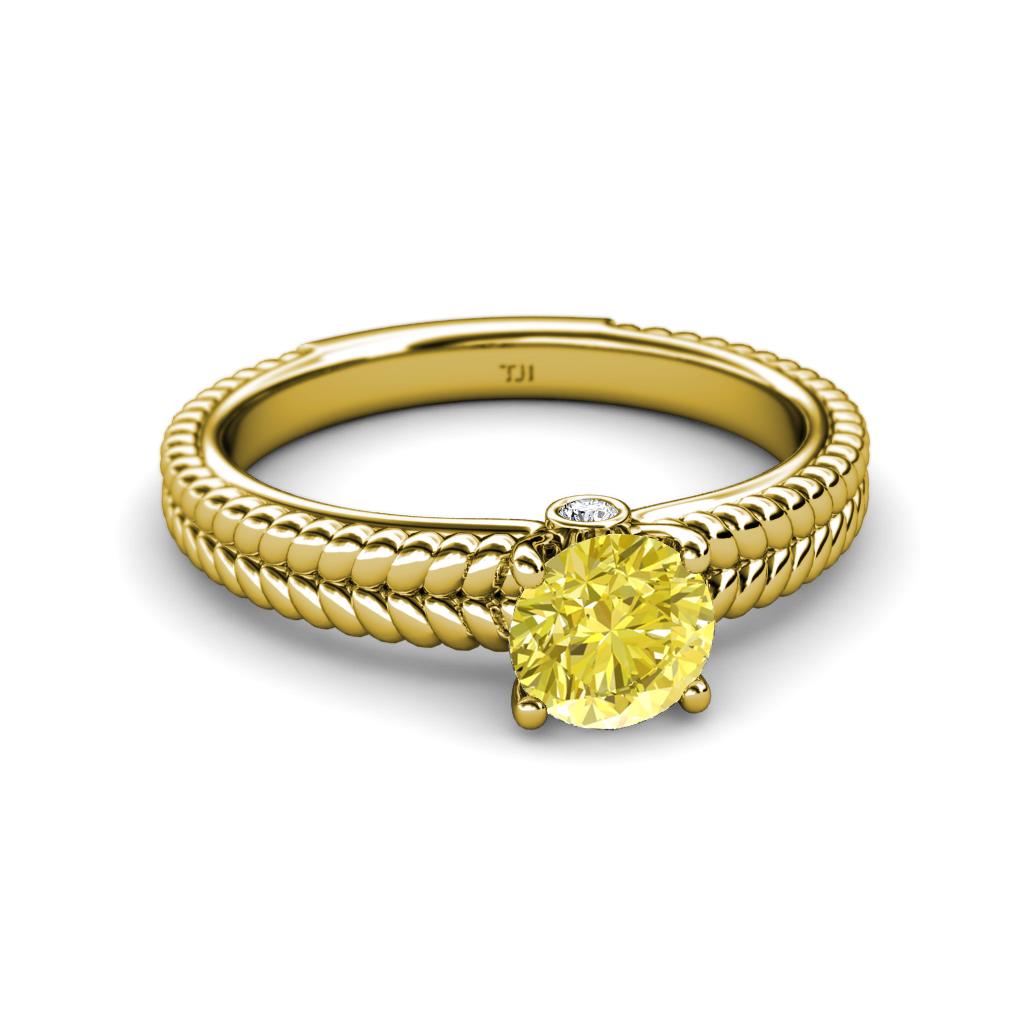 A Feast to your eyes, this dream Engagement Ring in 14K Yellow Gold with Center Yellow Diamond and Braided Shank with Bezel Set White Diamonds beneath the Head on either side creates a sophisticated design on the ring.