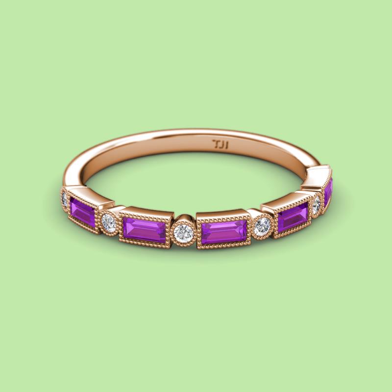 0.72 ctw Baguette Shape Amethyst (4x2 mm) and Round Lab Grown Diamond Womens Milgrain Wedding Band Stackable in 14K Rose Gold More Details ...