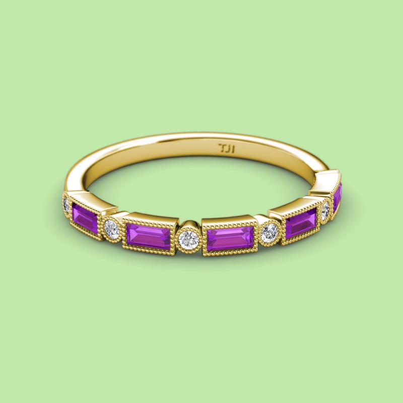 0.72 ctw Baguette Shape Diamond (4x2 mm) and Round Amethyst Women Milgrain Wedding Band Stackable in 14K Yellow Gold More Details ...