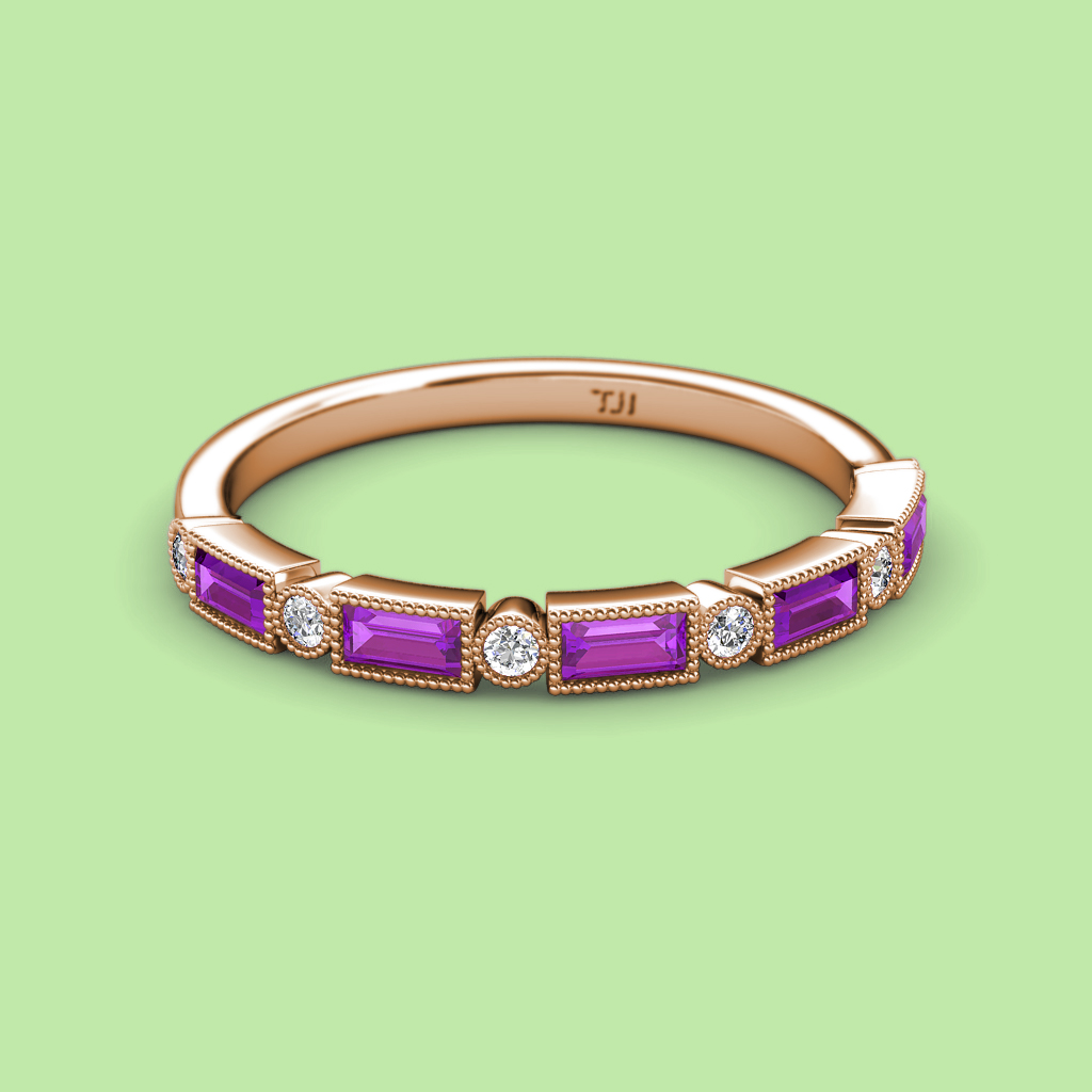 0.72 ctw Baguette Shape Diamond and Round Amethyst Women Milgrain Wedding Band Stackable in 10K Rose Gold More Details ...
